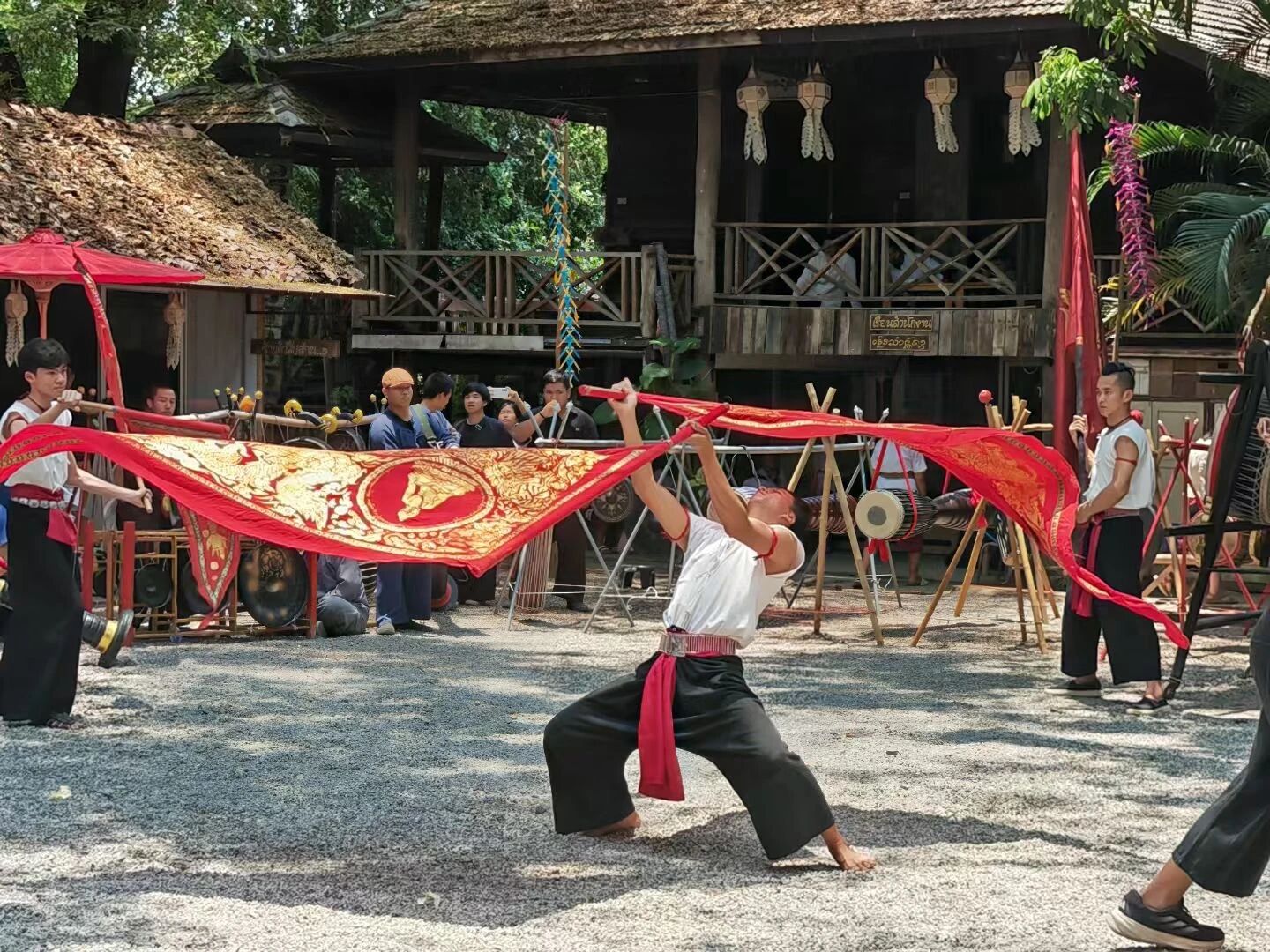 28年前,Chachawal老师开始了兰纳传统文化传承的探索实践。第一年围绕食物、药品、衣服、手工艺四个基本生活需求开展了4天的培训,发现参与的基本上是老年人,为了让年轻人更多参与,第二年增加了表演、比赛的形式。后来有人问在哪里学习,启发了他成立学校的想法,兰纳智慧学校应运而生,成为Chachawal老师兰纳传统文化探索实践的载体,也产生了第一批30位志愿老师。截止目前,兰纳智慧学校每年开展3期,每期2个月,向希望了解和学习兰纳文化的人群开放学习机会,学校仅向学生收取少量费用用于日常运营,教学的老师均为义务教学。在此次行程中我们有幸拜访了2位教学胜利鼓的老师和1位教学兰纳舞蹈的老师,参加了向兰纳传统教师“Wai Kru Pu Jan”表达感激之情的仪式,看到学校中除了长者,还有很多的儿童青少年,大家依据自己的兴趣学习和传承兰纳文化,过程中他们不仅获得心灵的满足,也交到很多的朋友。